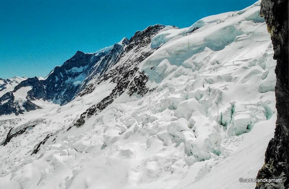 The alpine train journey gave me glimpses of the trekking possibilities in around Jungfraujoch. Apart from many easy day-treks which can be undertaken from the Interlaken, there are number of treks originating from Lauterbrunnen and Kliene Scheidegg. There are many village resorts which provide staying options for trekkers. In case of any emergency, there are options of cogwheel railways and cable cars on some of the trekking routes. However, trekking at the higher altitude involving snow and glaciers may be of a technical nature. For instance, trekking Aletsch glacier would require equipments that are necessary for snow trekking.