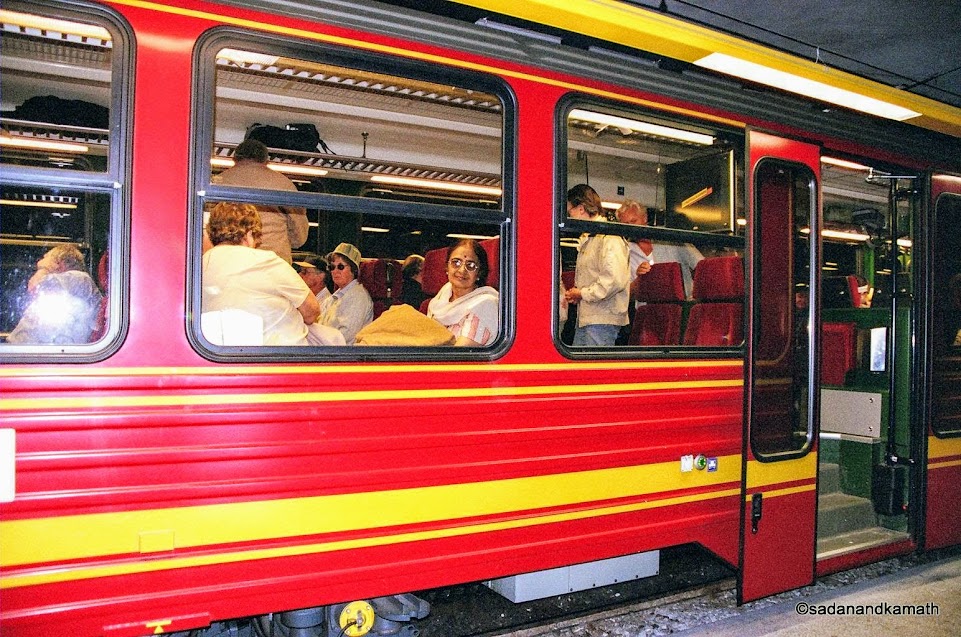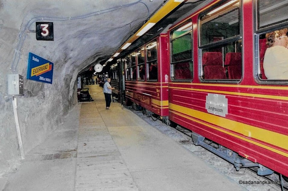 At Kliene Scheidegg, we had to again change to red and yellow strips train for Jungfraujoch. Some of the tourist who were travelling with us did not board the train to Jungfraujoch which came on the other side of the platform after few minutes. My guess was that they must have gone on trekking or on walking trips to the surrounding areas. The first 15 minutes journey up to Eigergletscher station was through vast meadows. The remaining 45 minutes journey was in the tunnel through the Eiger mountain.