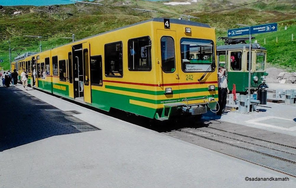 The green and yellow colour train to Kliene Scheidegg (2061m) was already on the other side of the platform. We rushed towards the train in waiting and again got the window seat. The one hour journey to Kliene Scheidegg was the most beautiful journey I had ever taken so far with incredible views - vast meadows, small villages, valleys and snow covered mountains with glaciers. We could see many walking trails from the train.