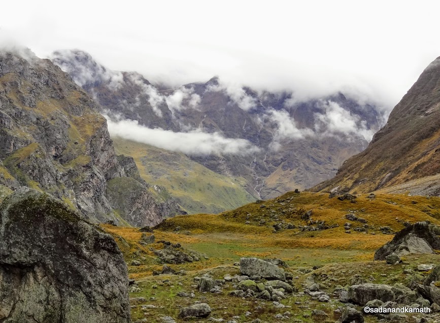 After crossing the first ridge, we faced the light showers. We had already put on our raincoats from the start. So there was no question of drenching in the rains. The light showers continued when we reached Chakrateerth. Here, we had a short break for the packed lunch. From Chakrateerth, the light showers turned into medium showers. After observing the cloud formation in the sky, we thought it fit to camp in Bandhar (3910m). We reached here around 12.30 p.m.