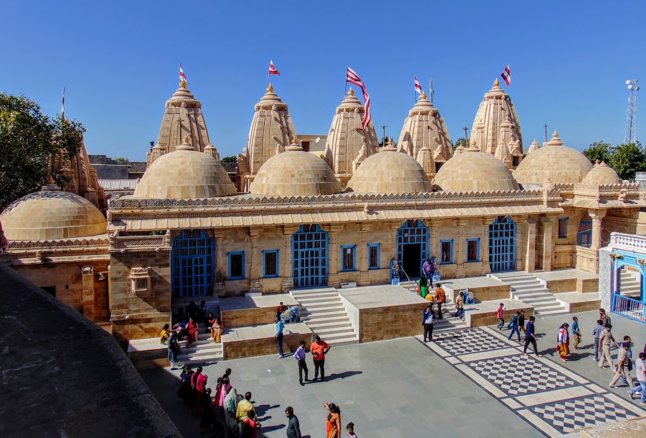 Trikamraiji temple on the shore of Narayan Sarovar (not visible). The temple complex is surrounded by high walls with a walkway (see right). Narayan Sarovar is behind the high wall.