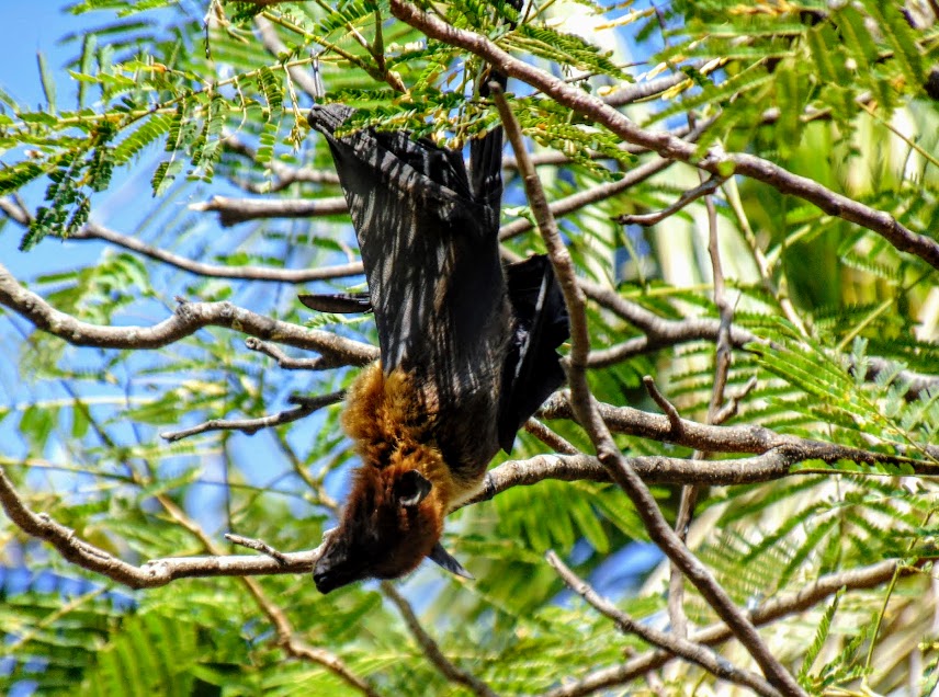 Bat among a big colony of bats on the trees of Sharad Baug Palace Complex.