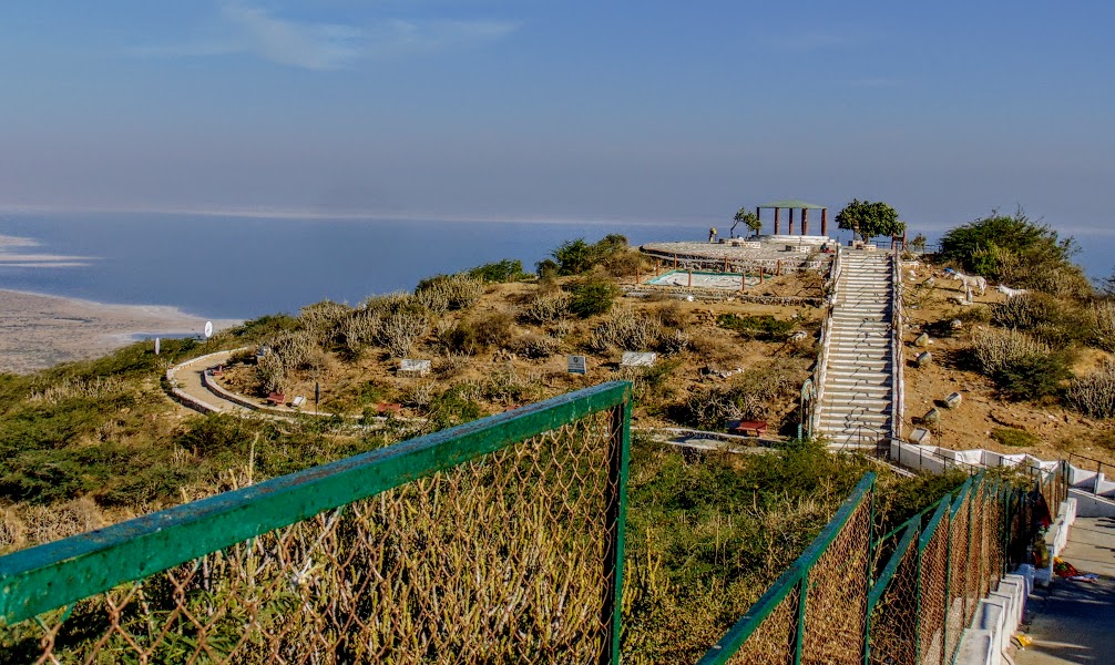 After the breakfast, we started the journey at around 8.30 am for Kalo Dungar. The journey was smooth except the last 4-5 kms which is winding hill road. We reached Kalo Dungar at around 10.00 am. From the parking lot, it is about 500 metre of walk on easy steps to reach the viewing point. Since the weather was hazy, we could not clearly see the  vast expanse of White Rann to capture in the picture. So was the case with India Bridge which otherwise is clearly visible from the Viewing Point at other times. However, Dholavira Lake (also called Rann of Kutchh Lake) was clearly visible. There are walking trails around Kalo Dungar for those who wish to enter into a bird sanctuary.