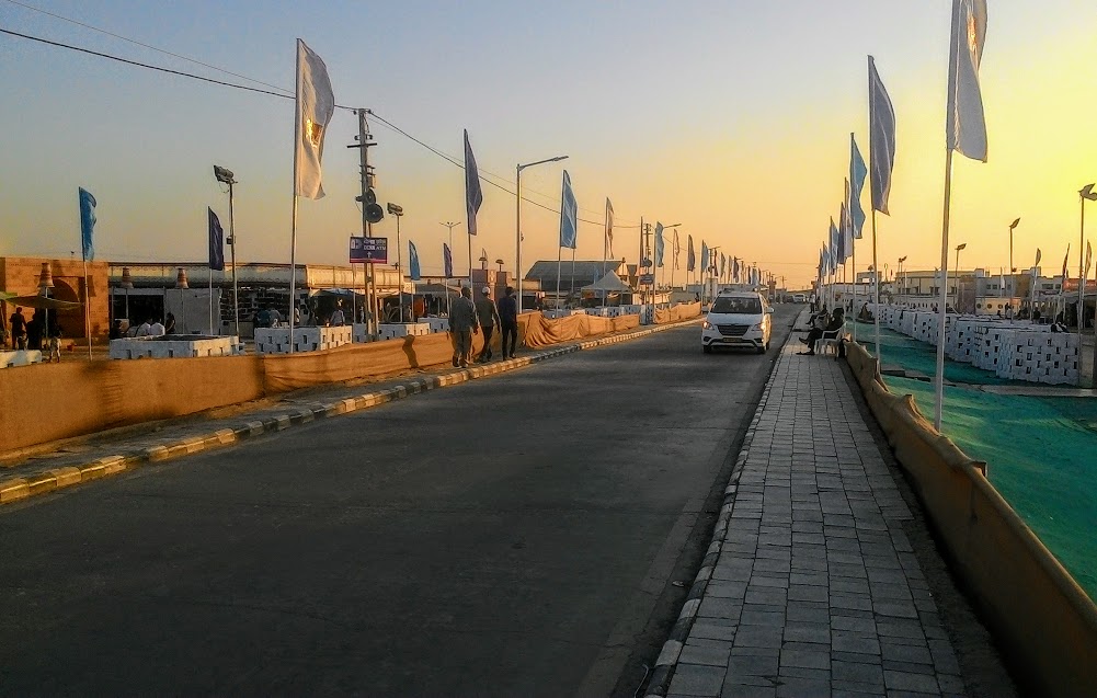 As usually happens at any sunset watching points in India, most of the large crowd of tourists were in a hurry to start their return journey. Due to limited accommodations in the White Rann region, most of the tourists would have come from Bhuj/Mandvi/Gandhidham as a day trip and they would be eager to go back as early as possible. There was heavy crowd of tourists  around Viewing Gallery to catch the transport in the form of camel/horse carts, electric toy train etc to take them to parking lots located outside the exit gate. We were not in a hurry to go back as we had to cover about 1 km from White Rann to catch the camel cart. Also we had decided to take a break at the temporary shopping complex in Dordo (near Tent City) to see Kutchhi handicraft items and to have tea at fast food stalls in the complex.