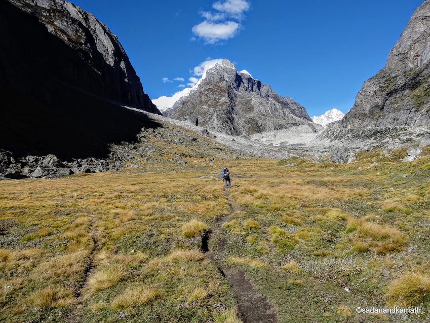 | Walking through Bandhar campsite with Mt. Chaukambha and Mt. Balkun in the background. |