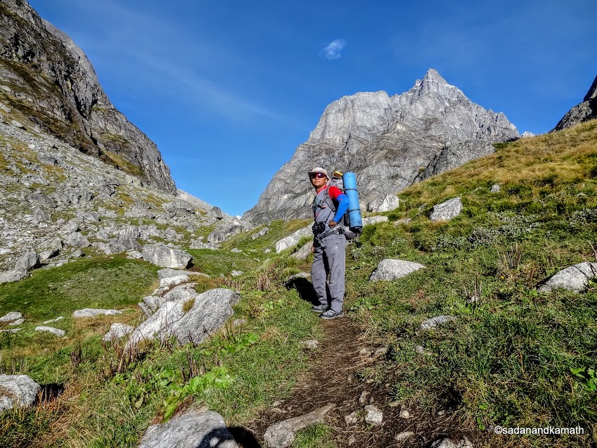 The stream which we had easily crossed 4 days back has become a bit risky to cross as water has been gushing thanks to two days of continuous rains. Here KS is being assisted by Sonu, the Guide to take a big leap from one boulder to another and climb in one go.