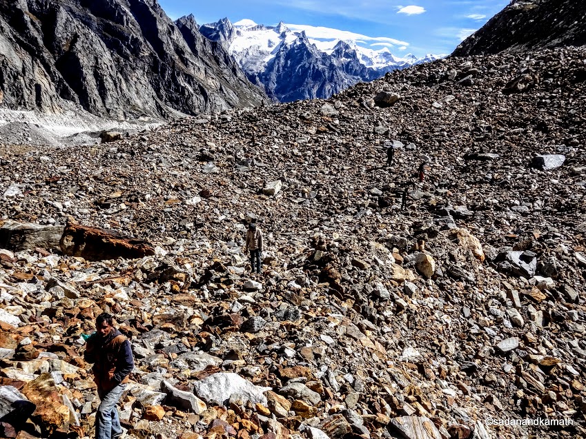 This part of the trek was more scenic than the previous day. For the first time, we could see Mt. Balkun (6067m) and some more unnamed peaks. From Laxmivan, we could see the bifurcation of path - the one to the right going towards Alkapuri (Bhagirathi Kharak glaciers) and to the left going to Satopanth glaciers which our mythology refers to as Swargarohini. Alaknanda river snout was also located in this bifurcation. Tonnes of ice sliding from these glaciers have been lying below the debris of moraines for years which is the main source of Alaknanda river. The scenes at the bifurcation were awesome.