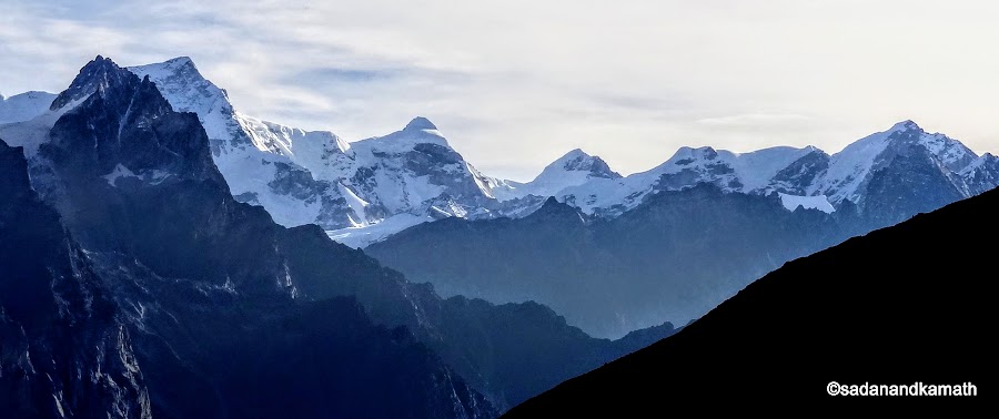 | Mt. Bangneu, Mt. Kamet, Mt. Deoban and other unidentified peaks seen from Chakrateerth in the morning. | |