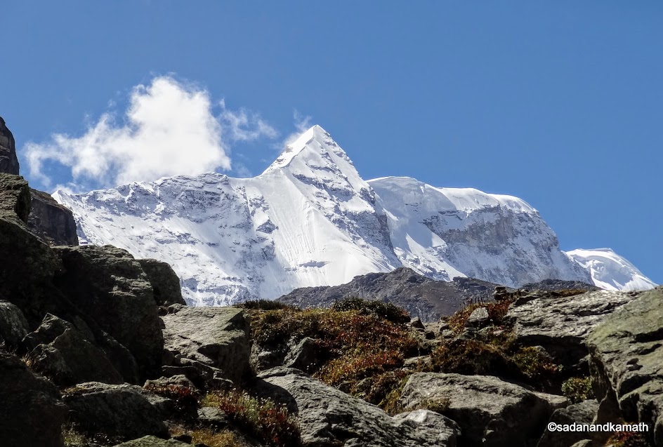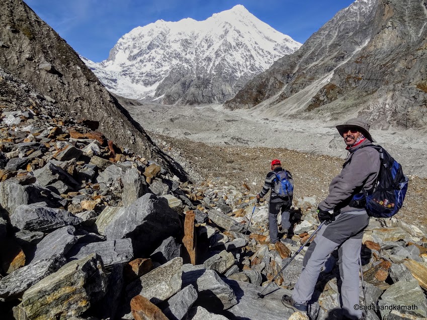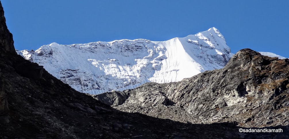 One positive aspect of our boulder hopping was that we could see Mt. Chaukambha at the close range (probably not more than 3-4 kms distance with its almost vertical base) and also the Satopanth glacier (also known as Swargarohini ice falls). Also Mt. Neelkanth was seen from the last ridge in a different perspective than what we have been seeing from the last two days. Unfortunately, by the time I reached the top of the last ridge to take the picture, Mt.Neelkanth was already covered with white cloud. However, KS who had reached earlier than me, had already clicked the picture.