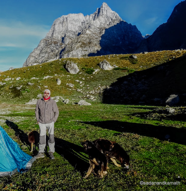 As soon as I came out of the tent, 3 Bhotia dogs, probably belonging to a shepherds' group who had camped with almost 500 goats and sheep, about 500m away from us, came running towards me in a friendly way waging their tails. I gave a part of the left over paratha from the packed lunch to one of the dogs. But the dog would not eat. Another dog came and ate it in one gulp. Oh! there seems to be a hierarchy among these dogs. The senior most or the leader would eat first. So I took the dog who had missed his paratha, to a distance and offered the remaining part which he ate. I thought that one of the dogs would accompany us in the trek as usually happens in almost all Himalayan treks, more so in this trek because a dog had accompanied Yudhishthir to Swargarohini (stairway to haven). But it was not to be with us.