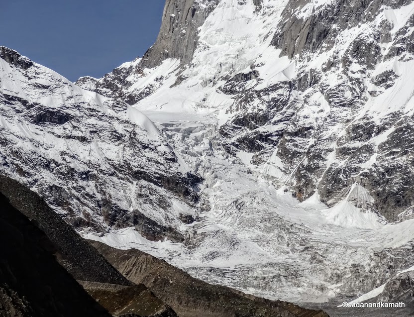 | A close up of what is called as Swargarohini (path to heaven) ice falls lying on the side of Mt. Chaukambha which only Yudhishthir among the Pandvas and a dog with him crossed the glacier to reach the heaven. In geography, it is called as Satopanth glacier, the melting of which created Satopanth Lake. | | |
