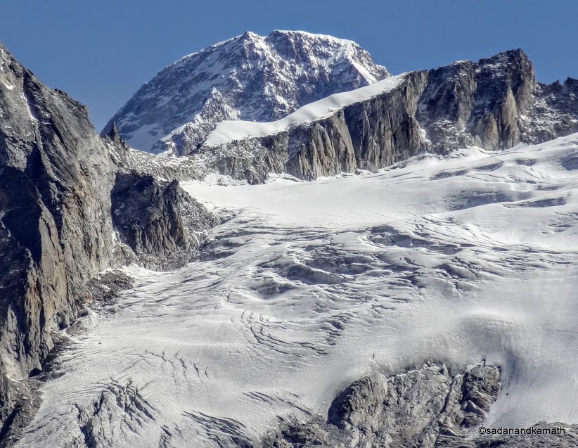 A zoomed shot of the top part of  eastern side left of Mt. Kamet (not visible).One can notice the numerous crevasses in the glacier. In the background is probably Mt. Bangneu (5710m).