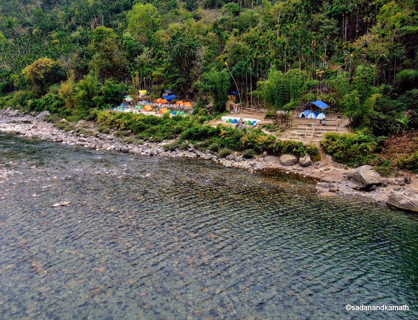 A suspension bridge over River Umngot took us to other side of the river. A rowing boat with a child was already on its way to the shore where we were heading. The boatman met us on the shore. He had crossed the river to collect a bunch of bamboos and transport back to the other side of the river for some construction work. From the bridge, we descended to the shore towards the campsite with a number of tents. River Umngot at Shnongpdeng is popular with water sports activities such as rowing, kayaking, snorkelling and also short hikes on the shores of the river. The entire area around the river was calm and serene.