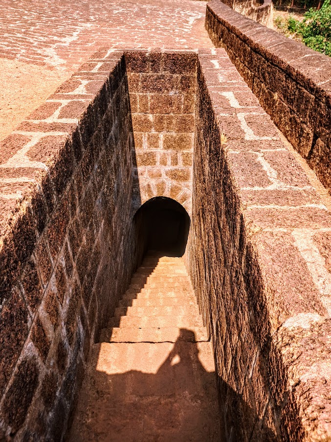 There are four entrances, the main and 3 subsidiaries gates of which one is a secret passage now closed. As we enter through the main gate, a climb of about 20 stairs leads to the open plain area covered by laterite stones. There is a staircase going down to a secret underground passage which was closed for the visitors. On the right side of the secret passage, there is a watch tower with a flag post. This flag post is used to unfurl India's flag during the Independence Day. As we move to the left side, there is a big round well now covered with grills on the top as a precautionary measure. The well has water throughout the year.