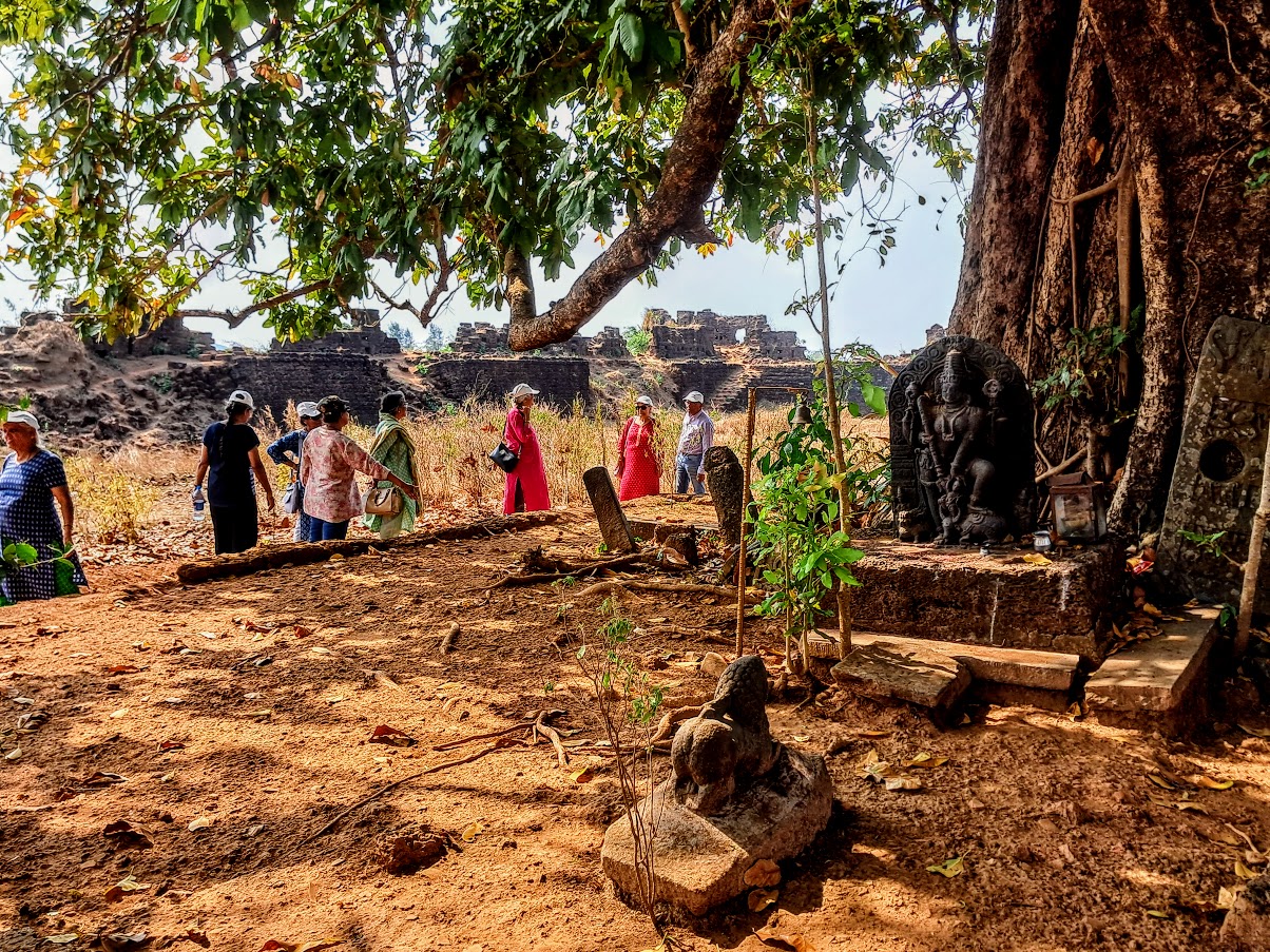 As we walked towards the backside of the Fort, we found one more well which was also covered with grills. There was a lone Banyan tree below which a stone sculpture of Mahisasur Mardini was kept in the open. This stone sculpture was found by ASI while excavating the Fort. There is also a stone sculpture of tiger kept opposite Mahisasur Mardini Sculpture. This is the only place on the Fort where one can sit under the shadow of the Banyan tree after walking under the sun for a long time.